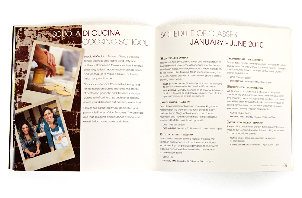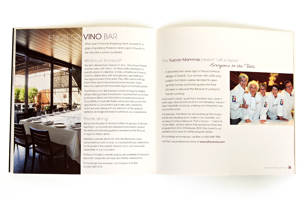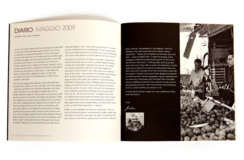 The newsletter provided information about news and upcoming events at Enoteca Sileno, showcased new products imported from Italy, and highlighted special gift-packs available during the Christmas season. The idea was to create a newsletter that portrayed the rustic look of old Italy. The combination of old Italian charm and the crisp clean layout produced a unique and elegant look when printed on 100% recycled paper.